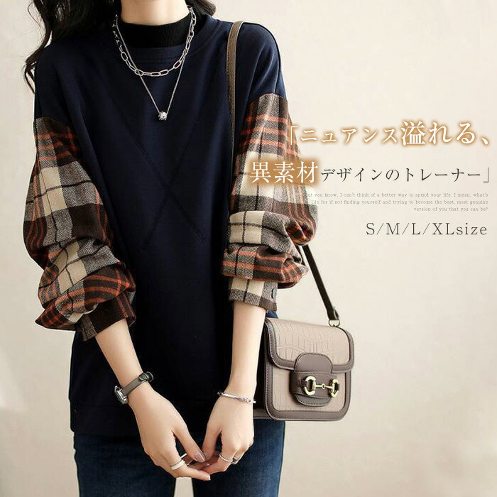 切り替え トレーナー 秋 冬 春 長袖 レディース ブラウス クルーネック 異素材 ドッキング スウェット トップス プルオーバー チェック ゆったり 大きいサイズ 秋冬 カジュアル シンプル 通勤
