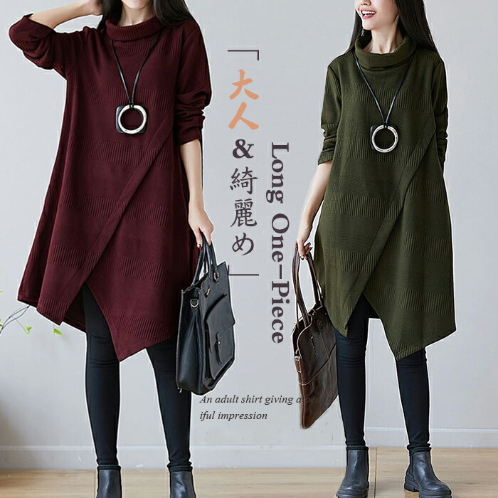 ワンピース レディース 膝丈ワンピース チュニック 冬物 秋冬 ひざ丈 不規則 ロングワンピース 膝丈チュニック Aライン 無地 タートルネック ハイネック 大きいサイズ レイヤード 個性 体型カバー