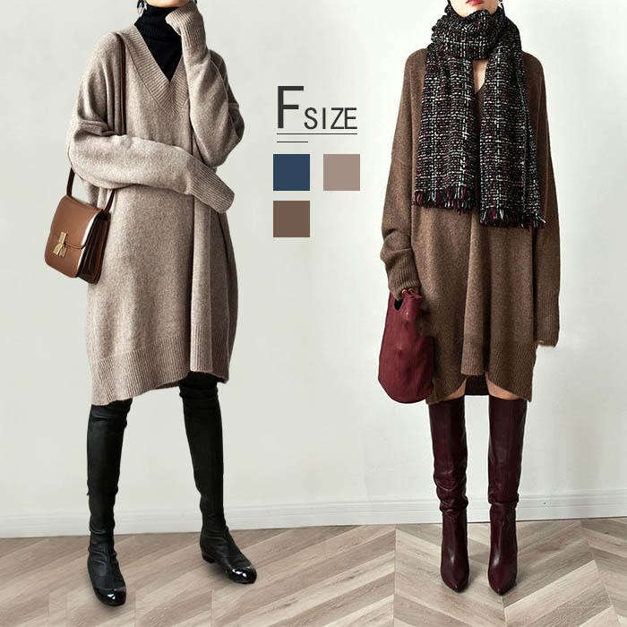 ワンピース Vネック ニットチュニック レディース チュニック 長袖 セーター トップス ニット 秋冬 ニットソー ニットワンピース ゆったりカジュアル 膝丈 膝上丈 無地 オシャレ