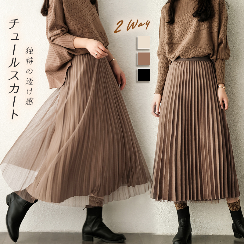 スカート チュールスカート 2WAY プリーツスカート ロングスカート フレアスカート レディース 秋冬 春 リバーシブル チュール 透け感 フェミニン 大人 フレア プリーツ ウエストゴム ロング