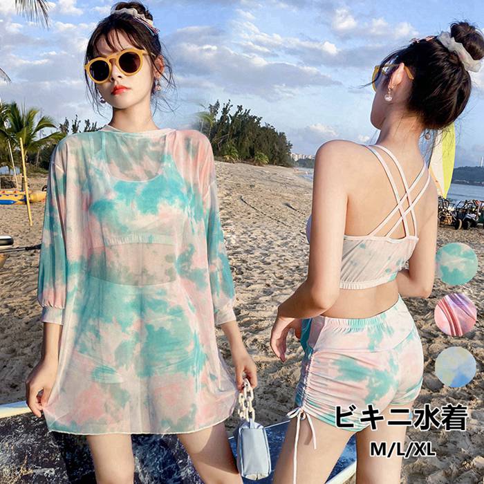 \夏特割12%OFFクーポン/一部 水着 レディース ビキニ カラフルレースワンピース 3点セット 体型カバー水着 20代 30代40代 ミセス ママ水着 ワイヤーなし セクシー 女性 ラウンドネック