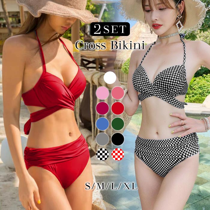 水着 水着セット レディース 春 夏 春夏 黒 白 無地 ビキニ セット スイムウエア クロス ブラック ホワイト ピンク レッド カーキ チェックトップス ビキニセット ギャル 大きい 海
