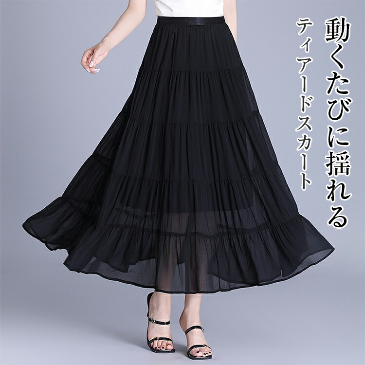 12%OFFクーポン配布中 スカート レディース 夏 ティアードスカート ボトムス ロング丈スカート シフォンスカート ウエストゴム Aライン ロング 裏地付き お洒落 ゆったり 大き 上品