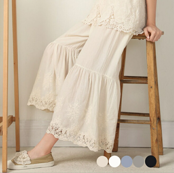 ワイドパンツ ワイド レディース ボトムス ガウチョパンツ レース 刺繍 フレア フレアパンツ パンツ 綿 コットン 大きいサイズ 花柄 ロング きれいめ シアー ウエストゴム ゴム 体型 レイヤード