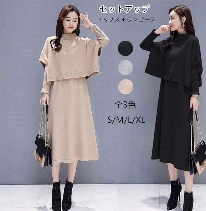 セットアップ レディース 秋冬 ワンピース ブラウス 無地 ニットセーター+長袖ワンピース 2点セット ロングワンピース きれいめ 上品 エレガント 体型カバー 着痩せ ニットソー