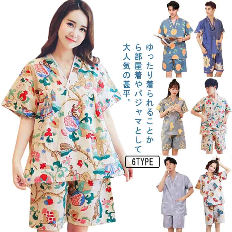 送料無料 ペアリング 甚平 レディース パジャマ ルームウェア メンズ 花柄 花火大会 夏祭り 部屋着 綿
