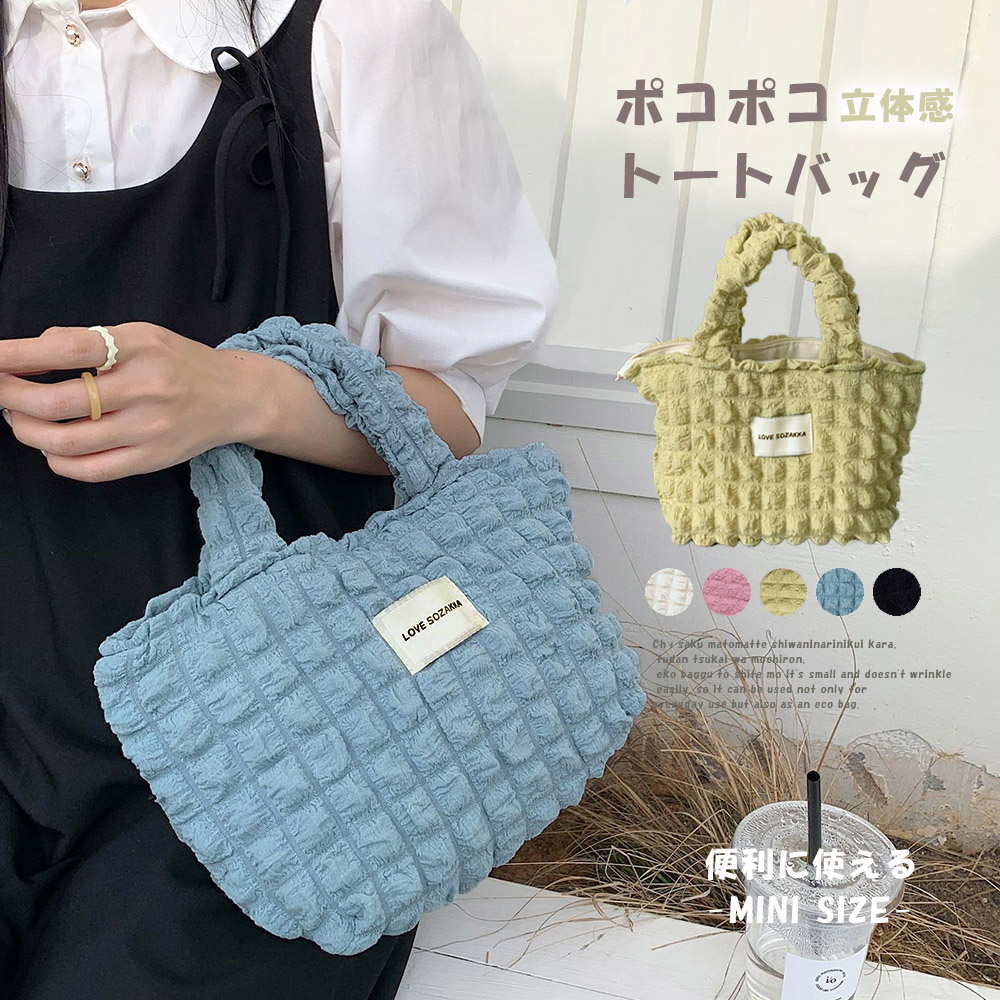 ミニトートバッグ ポップコーン軽量バッグ レディース 可愛い 英字ロゴ キルティング ハンドバッグ ぽこぽこ 韓国風 手提げかばん おしゃれ お出かけ 3SBA サブバッグ