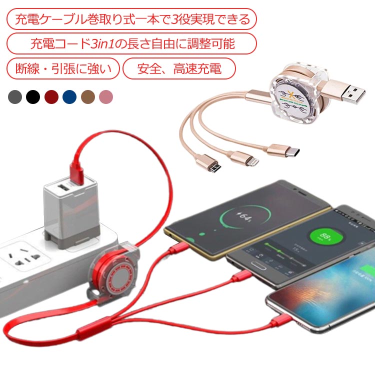 3in1充電ケーブル 巻き取り ライトニング USB Type-C 充電ケーブル 1本3役 1m 両面挿し 急速充電 断線防止 耐久性 収納便利 長さ調整可能 iPhone 全機種対応