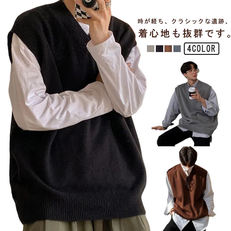 送料無料 ニットベスト メンズ ネック 秋冬 重ね着 レイヤード 制服 おしゃれ オーバーサイズ 韓国ファッション ゆったり ブラック ホワイト ブラウン グレー