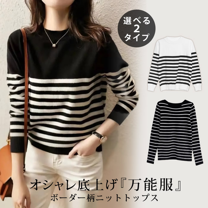 ニットトップス レディース 秋 冬 秋冬 黒 白 ニット トップス 長袖ニット 長袖 ボーダー チュニック セーター ボーダーニット ストレッチ ブラック ホワイト カジュアル オフィス