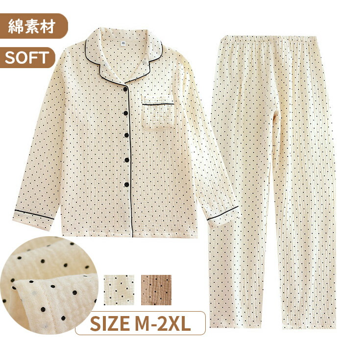 レディース パジャマ 綿 2点上下セットアップ 長袖 ロングパンツ ガーゼ ルームウェア Vネック ナイトウェア 部屋着 寝巻き シンプル ウエストゴム 春夏秋 敬老の日 入院 水玉 オールシ 父の日