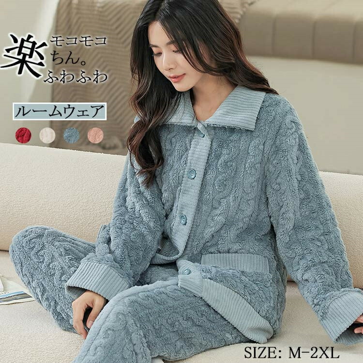 ルームウェア レディース 冬 上下セット もこもこ パジャマ 前開き ふわふわ 暖かい 部屋着 ボタン 折り襟 小顔 セットアップ モコモコ 長ズボン 軽い 極暖 女性用 柔らかい 肌触りい あったか