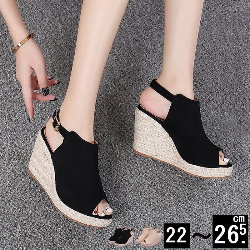サンダル レディース オープントゥ 厚底 クッション ウェッジソール ヒール つっかけ 9.5cm スエード 歩きやすい 安定感 ベージュ ブラック 大きいサイズ 3L 幅広で痛くない 黒
