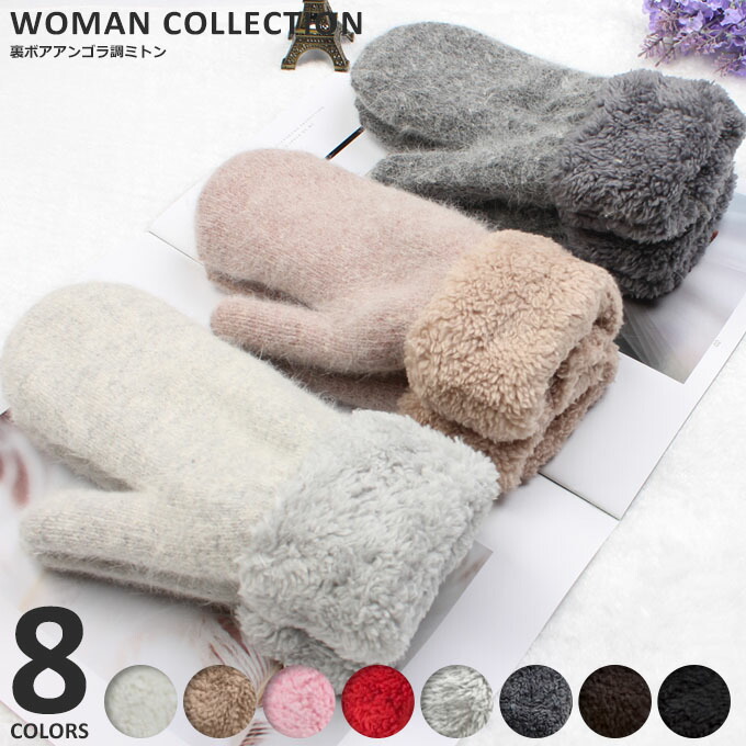 手袋 ミトン ボア レディース かわいい 冬 秋冬 ニット 【メール便送料無料♪02】 グローブ ムートン ハンドウォーマー 暖か アンゴラ 黒 ブラック 白 茶 グレー ベージュ 赤 ピンク