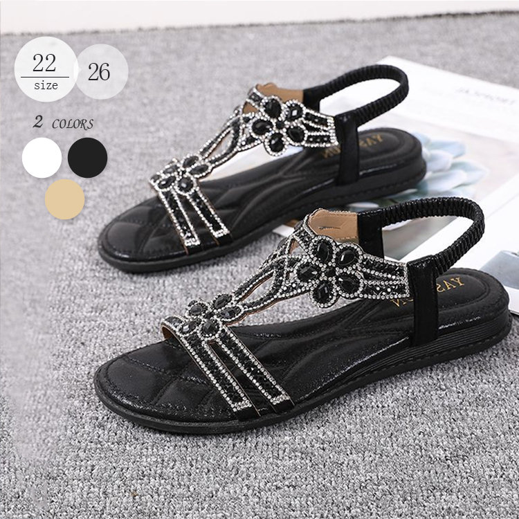 サンダル レディース ぺたんこ ワイズ 3E フラットサンダル フラットシューズ 歩きやすい 旅行 おしゃれ 靴 大きいサイズ ローヒール 甲高 幅広 足が痛くならない ビジュー