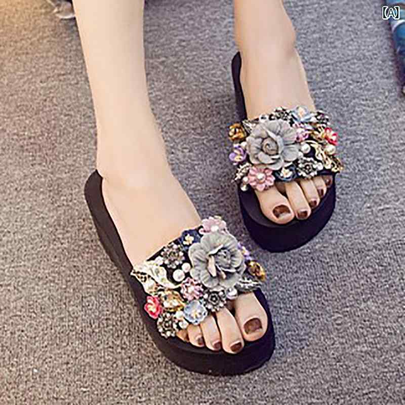 サンダル 夏 スリッパ 女性 屋外 ラインストーン フラワー ウェッジ ヒール 厚底 万能 シューズ デザイン カジュアル レジャー 花