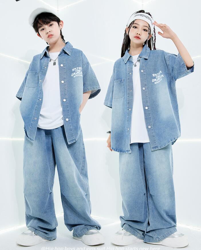 キッズ ダンス 衣装 デニムシャツ デニムパンツ 男女兼用 ジャズ ヒップホップ ダボ感 演出服 子供 デニム衣装 hiphop ダンス衣装 ブルー jazz