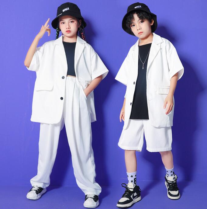 キッズかっこいいダンス衣装 jazz hiphop スーツ風 ダンス衣装男女兼用 半袖 ジャケット パンツ ジャズ ヒップホップ 演出服 文化祭 個性 2点セット 3点セット ホワイトスー ダンス衣装
