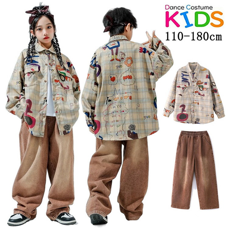 チェック柄 長袖 シャツ 子供 キッズ ダンス衣装 男の子 女の子 ストリート セットアップ 韓国 ステージ衣装 b系 jazz K-POP 派手 上下セット パンツ HIPHOP 応援団 トップス