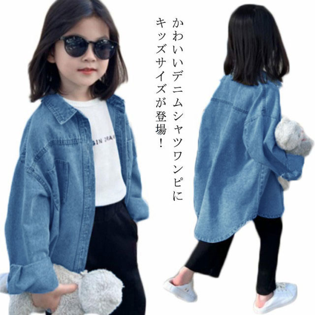 シャツワンピース デニムシャツ キッズ 女の子 デニム チュニック ブラウス 長袖 ロング カジュアルシャツ ゆったり 無地 羽織り 薄手 前後差 90 100 110 130 140 150 120