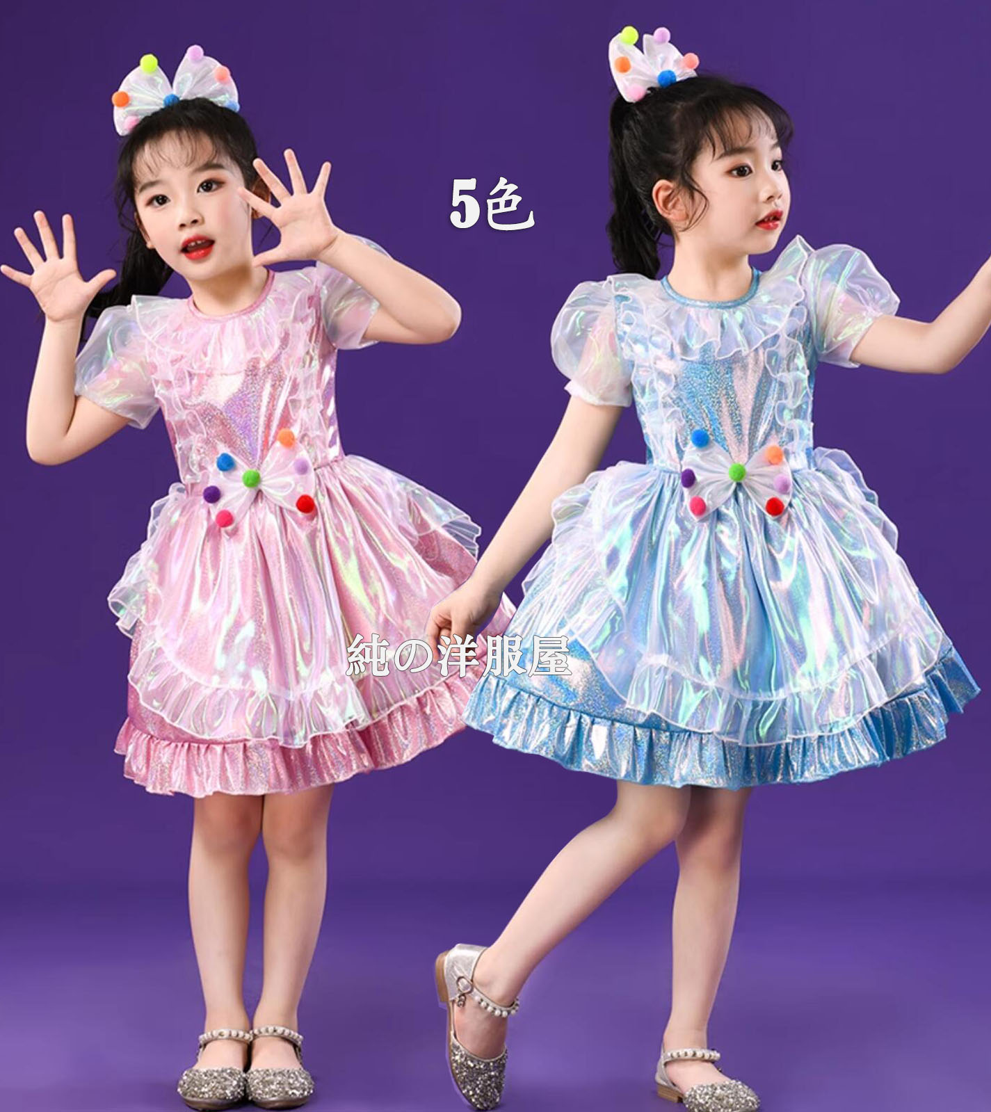 子供ダンス衣装 女の子 ふわふわ ワンピース 半袖 膝丈 ショート丈 裾フリル 透明のエプロン付き 光沢 きらきらの生地 かわいい キッズ ジュニア 発表会 演奏会 演出 合唱