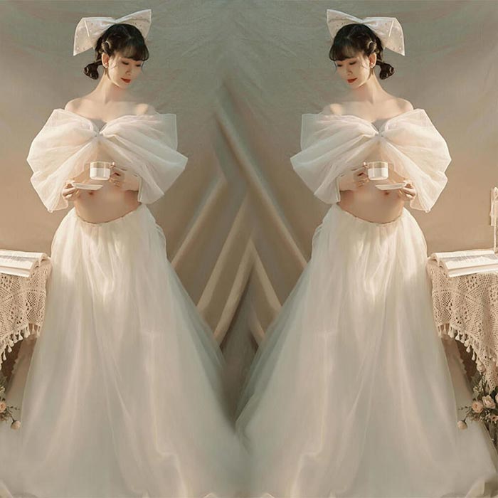 マタニティ フォト ドレス オフショルダー スカート セット リボン可愛い キュート 思い出 メモリーフォト 記念写真 ホワイト 記念撮影