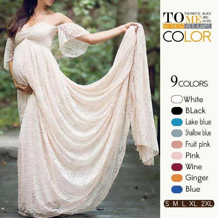 ワンピース マタニティフォト オフショルダー ボリューム マキシ丈 オフショル マタニティドレス ロング マキシワンピ フレア レース 記念写真 ブラック ピンクS M L ホワイト
