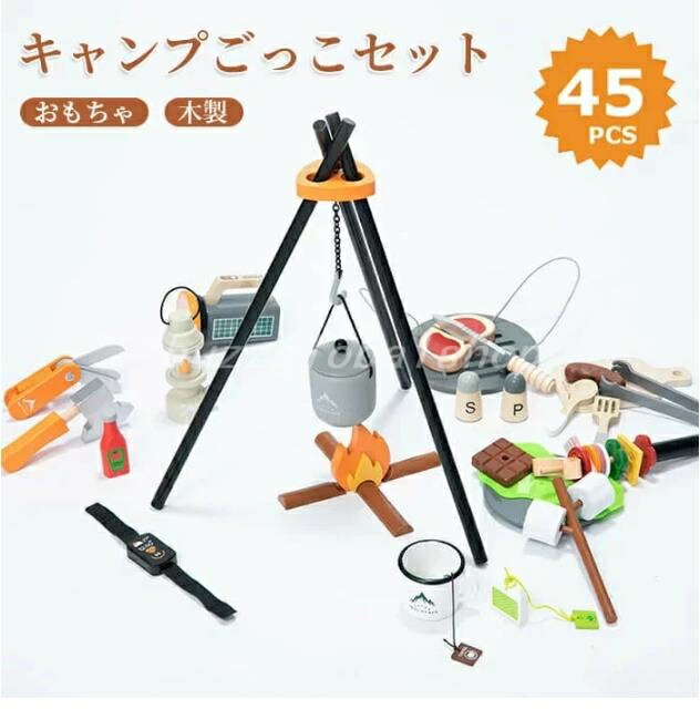 おままごとセット 木製 キャンプごっこセット おもちゃ キャンプファイア キャンプごっこ 45PCS アウトドア テント ごっこ遊び 野菜 男の子 女の子 室内 室外遊具 グリル 食器 コ 収納バッグ