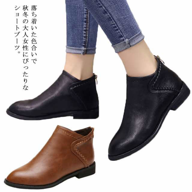 ローヒール ショートブーツ レディース 大きいサイズ サイドジップ ペタンコ 歩きやすい 痛くない 脚長 防寒 秋冬 春 ボア PU ブラック 黒 通勤 22.0 22.5 23 21.5