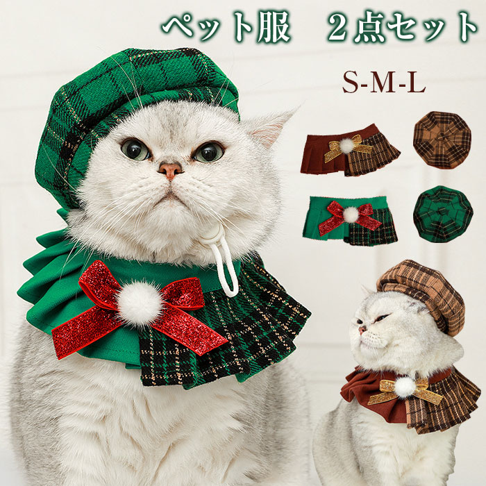 ペット服 クリスマス 秋冬 犬用 猫用 クリスマスコスチューム 服 帽子 ワンピース ペット衣装 ペット着ぐるみ 2点セット ペットウエア 仮装 パーティー おしゃれ 可愛い チェック柄 洋 ペット用