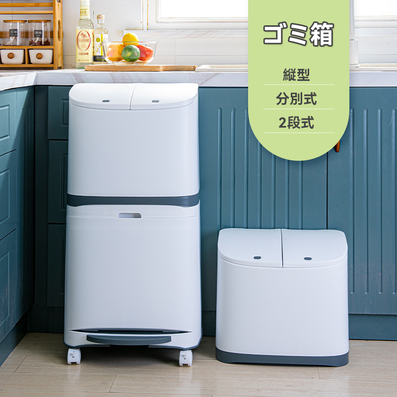 ゴミ箱 縦型分類ワゴンペール 分別ペール 上段19L 下段20L ワゴンペール キャスター 移動ペール 押して蓋を開ける 乾湿分離 縦型 キャスター付き ごみ箱 ダストボッ 分類
