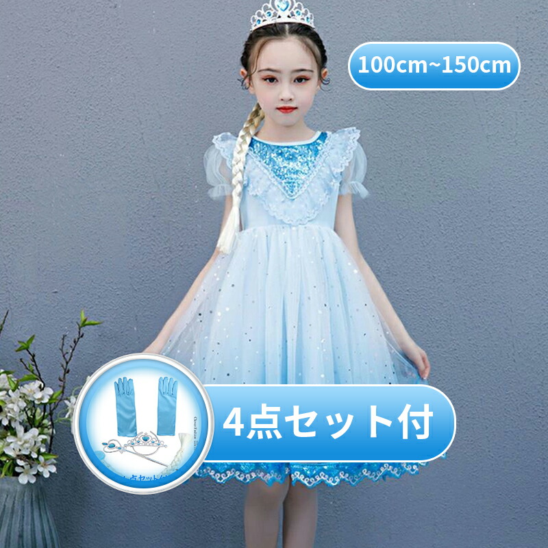 エルサ風ドレス ハロウィンワンピース 仮装 子供服 ティアラセット付き 4点セット付き 衣装 コスプレ キッズ 子供 ドレス ハ 大人気 幼稚園 誕生日プレゼント クリスマス 100~150cm