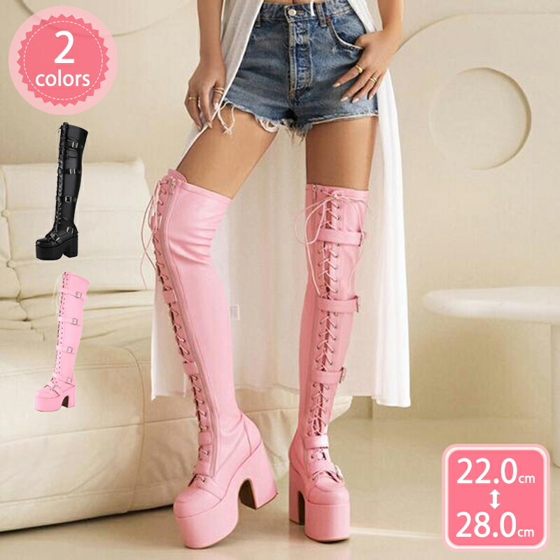 ゴスロリ 風 編み上げ 厚底 ニーハイ ロング ブーツ レースアップ ゴシック ロリータ レディース ガールズ ハイヒール 美脚 11.5センチ レースアップブーツ サイハイブーツ 編み上げブ ヒール