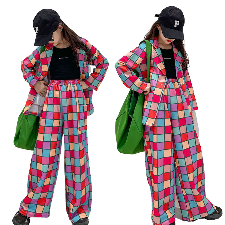 ガールズ ジャズ ダンス衣装 スーツ セットアップ ジャケット チェック柄 女の子 キッズ ヒップホップ 派手 韓国 -