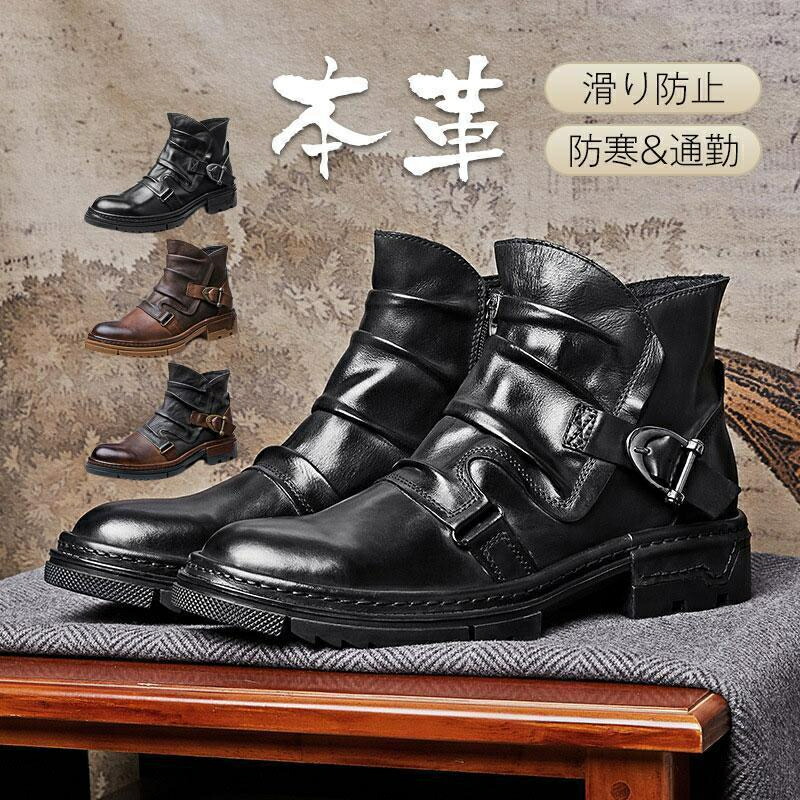 本革 ショートブーツ メンズ 牛革 高級感 革靴 かっこいい エンジニアブーツ 滑り防止 保温 防寒靴 ボア付き カジュアル 暖かい