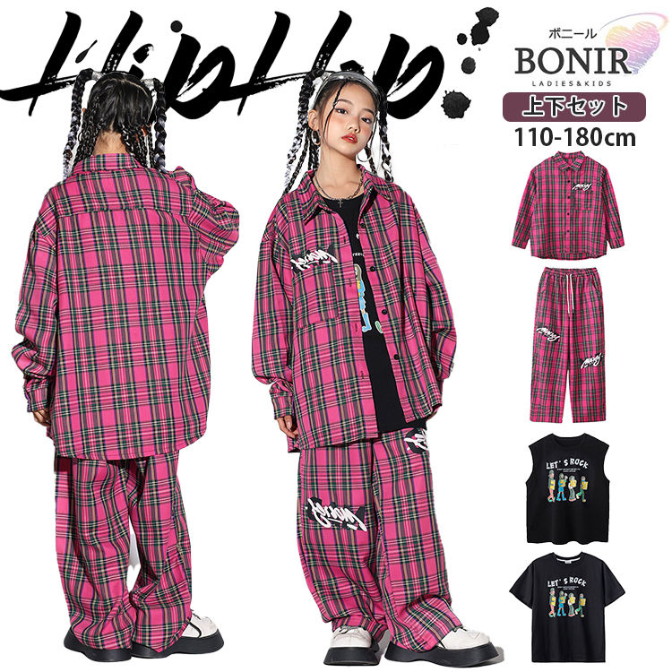 タータンチェック シャツ ピンク 長袖 キッズ ダンス衣装 セットアップ 女の子 男の子 チェック柄 上下 ズボン パンツ タンクトップ 黒 Tシャツ k-pop 子供服 韓国風 原宿系 カッ 応援団