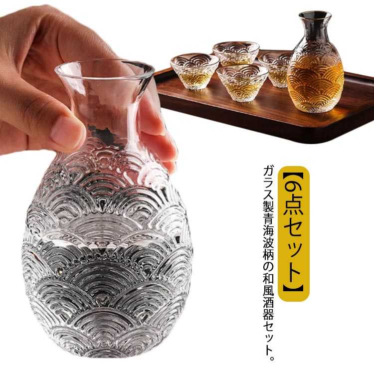 おちょこ 燗酒 和風 冷酒器 おしゃれ ガラス 熱燗器 青海波柄 温め器 温め お猪口 ぐい呑み とっくり 熱燗 クリア 高級感 酒器セット 6点セット 和酒 焼酎 セット 日本酒 酒燗 冷酒