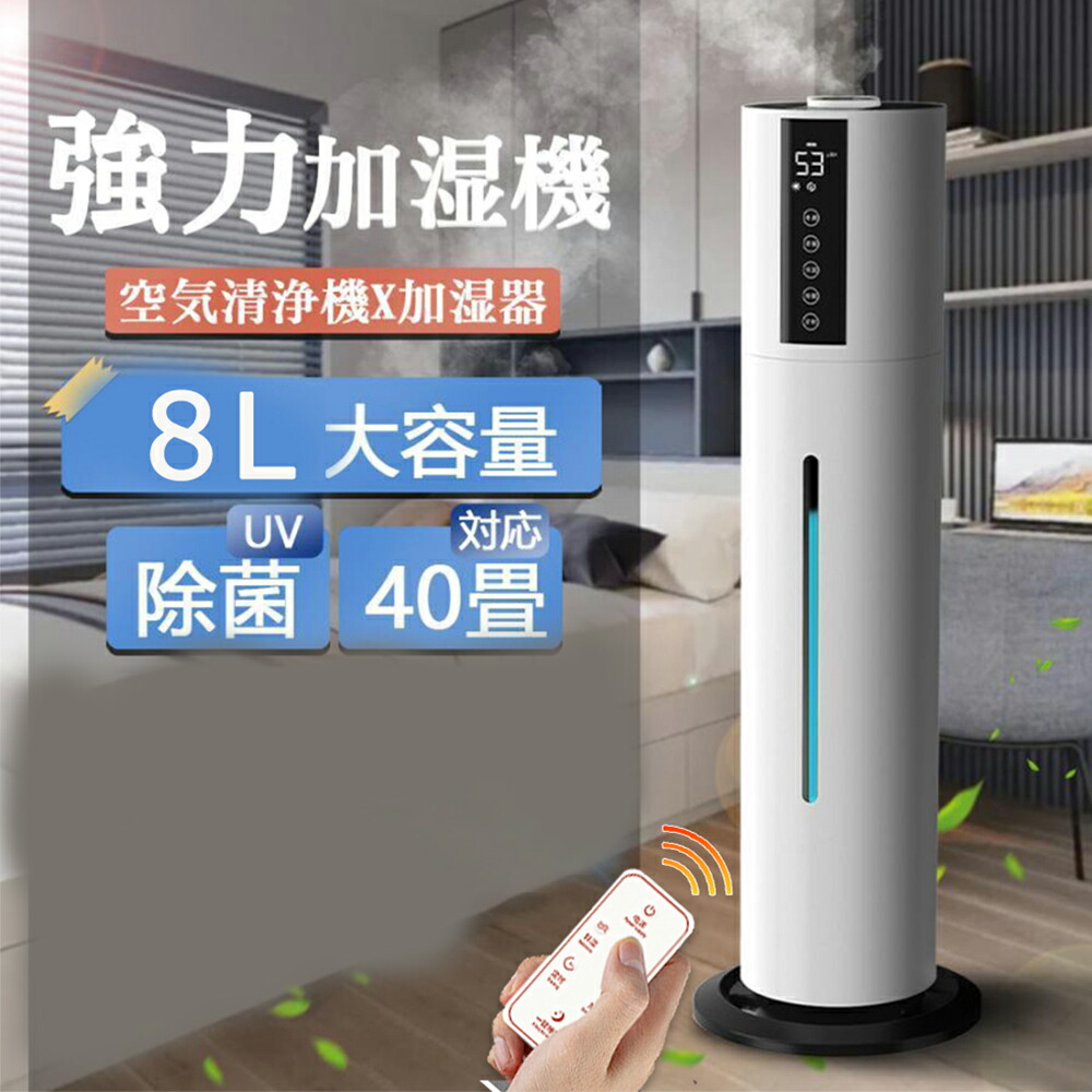 超ポイントバック祭開催中 限定P10倍 加湿器 大容量 8L 除菌 タワー型加湿器 次亜塩素酸水対応 4重除菌 超音波加湿器 UV除菌 上から給水 お手入れ簡単 空焚き防止 湿度センサー