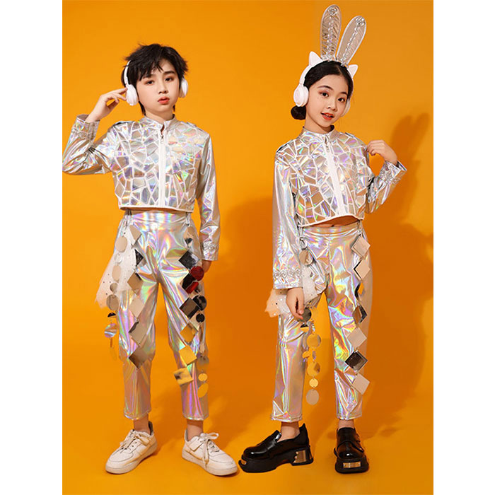 子供ヒップホップ ダンス衣装 男女兼用 ステージ衣装 トップス パンツ キラキラ 髪飾り ジャズダンス 韓国子供 リングショット テクノスタイル ヒップホップ ストリートダンス ユニセック ロボット風