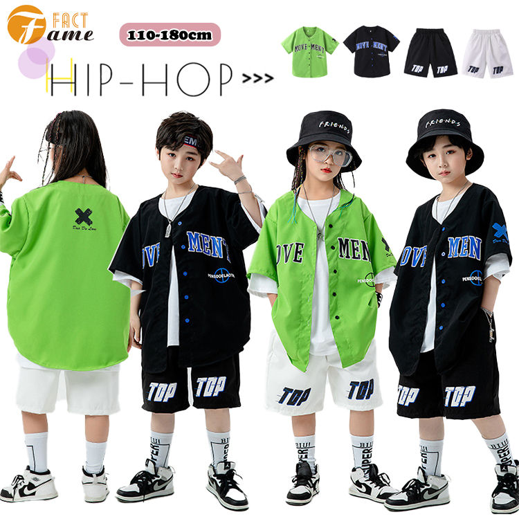 ダンス衣装 キッズ セットアップ 三点セット ベースボール ジャズ 子供服 女の子 男の子 グリーン ブラック 野球風 舞台衣装 半袖シャツ パンツ 演出服 カッコイイ おし ヒップホップ