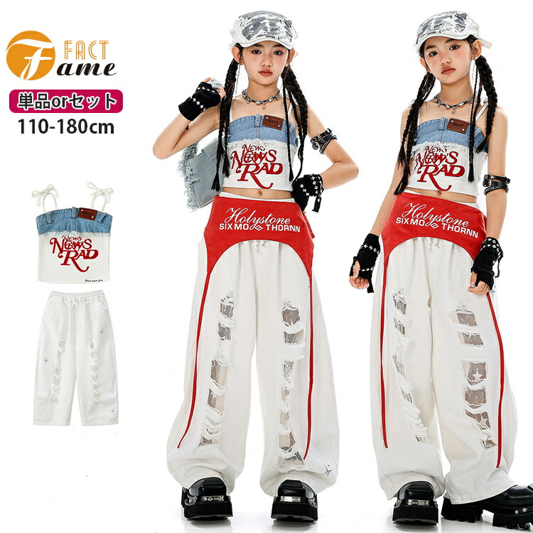 キッズ ダンス衣装 ダメージ ガールズ キャミソール 女の子 ジャズ ヒップホップ ストリート系 ズボン ゆったり カッコイイ セットアップ 演出服 ダンスウェア イベント 応援団 団体服 お 運動会