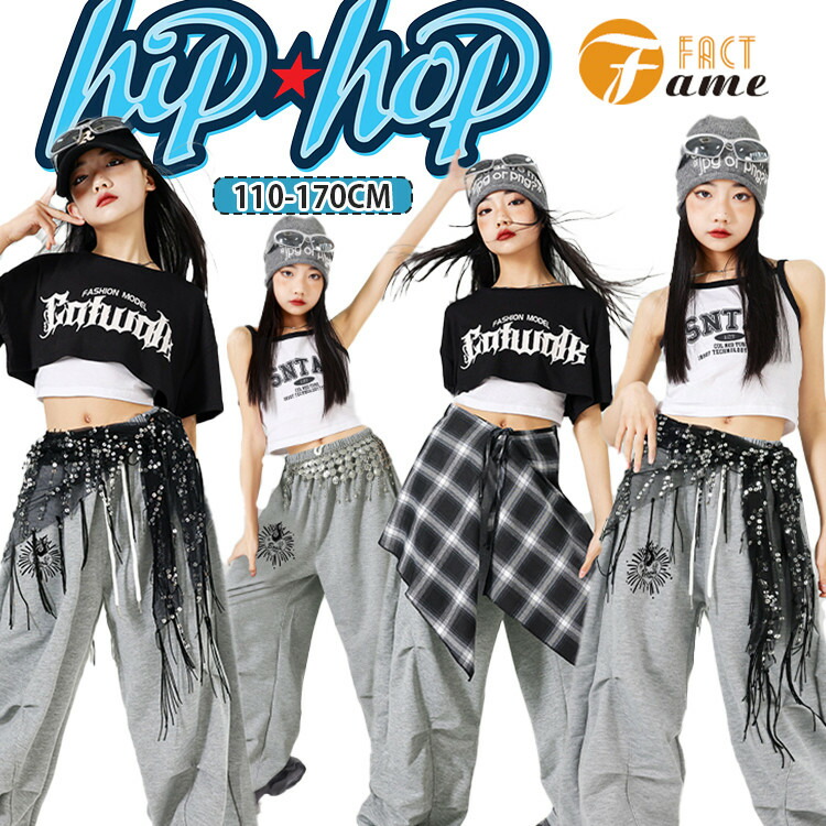 ショート丈 Tシャツ ダンス衣装 こども 子供服 キッズ 女の子 ガールズ ブラック 半袖 へそ出し 白 キャミソール グレー スウェットパンツ チェック フリンジ 巻きスカート jazz チュール
