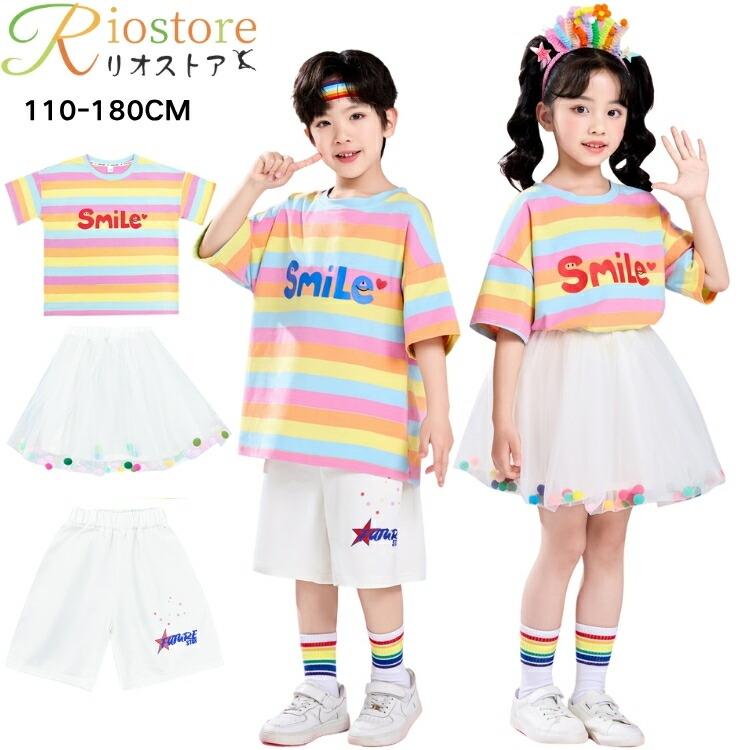子供服 ダンス衣装 キッズ ダンスの発表会 ボーダー柄 英字柄 Tシャツ 幼稚園 小学生 団体服 女の子 男の子 白 チュールスカート パンツ ステージ衣装 セットアップ 団体 演出服 派手 可愛い