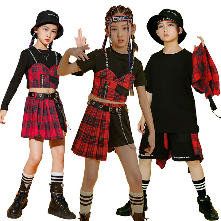キッズ ダンス 黒 赤 ギンガムチェック柄 上下セット 子供ダンス衣装 ヒップホップ 女の子 男の子 ジャズ おしゃれ シャツ スカート ショートパンツ