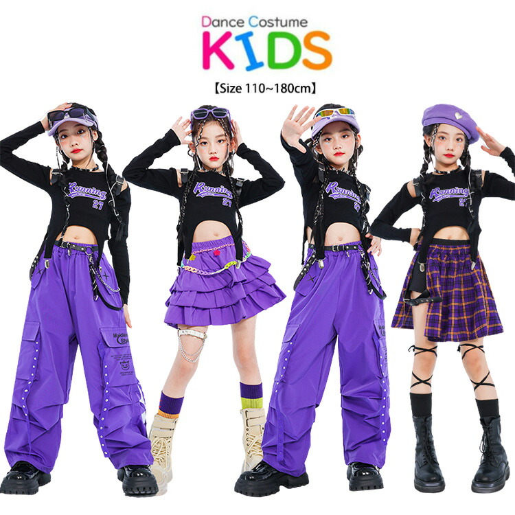 キッズ ダンス 衣装 ヒップホップ 黒 パープル へそ出し スカート ズボン 女の子 K-POP かっこいい JAZZ 幼稚園 応援団 発表会 舞台服 個性派 練習着 団体服 ステ 演出服