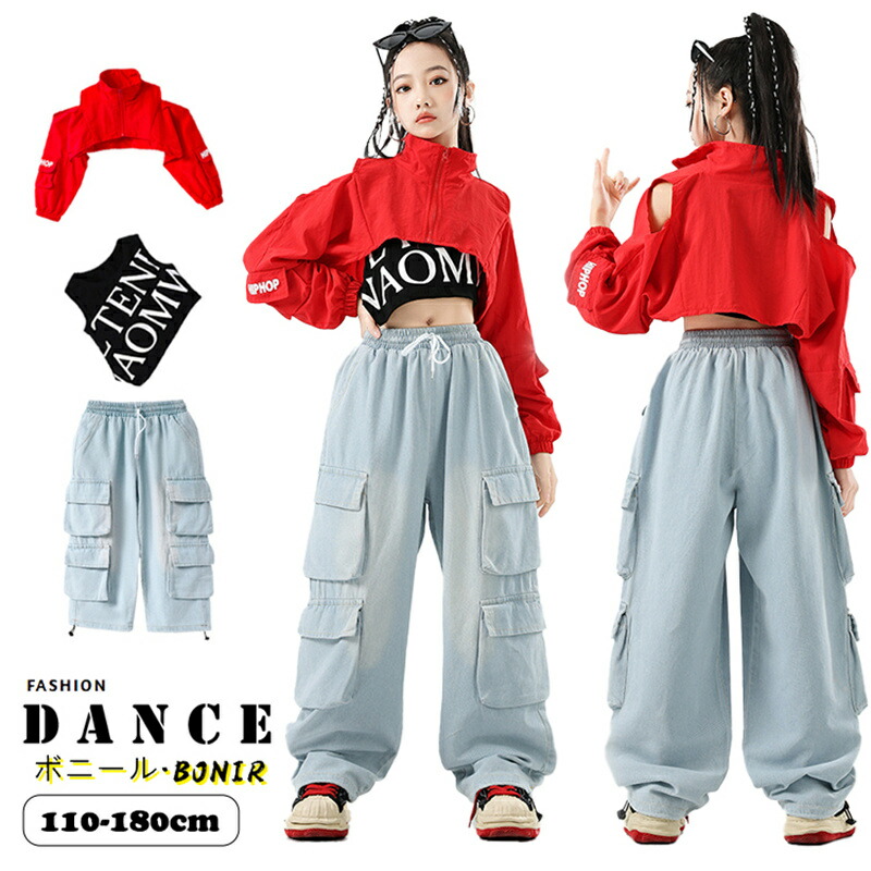 女の子 赤 へそ出し トップス スポーツウェア ジャスダンス ダンス衣装 キッズ セットアップ チーム衣装 練習着 可愛い デニムズボン ポケット付き 黒 タンクトップ 団体服 応援団 演出服 子供服