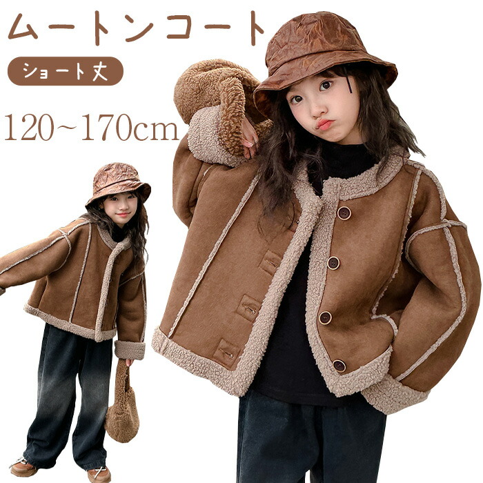 キッズ 女の子 ムートンコート ガールズ ジャケット ショート丈 クルーネック ボアコート ボアジャケット ボアブルゾン 毛服 カシミヤライク フェイクウール 無地 防寒 秋冬 子供服