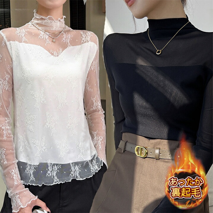 裏起毛シアートップス 選べる2タイプ ハイネック シアートップス 裏起毛 長袖 シアー シースルー トップス レイヤードインナー 秋服 冬服 温かい あったか 冬 あったか裏起毛レースカットソー