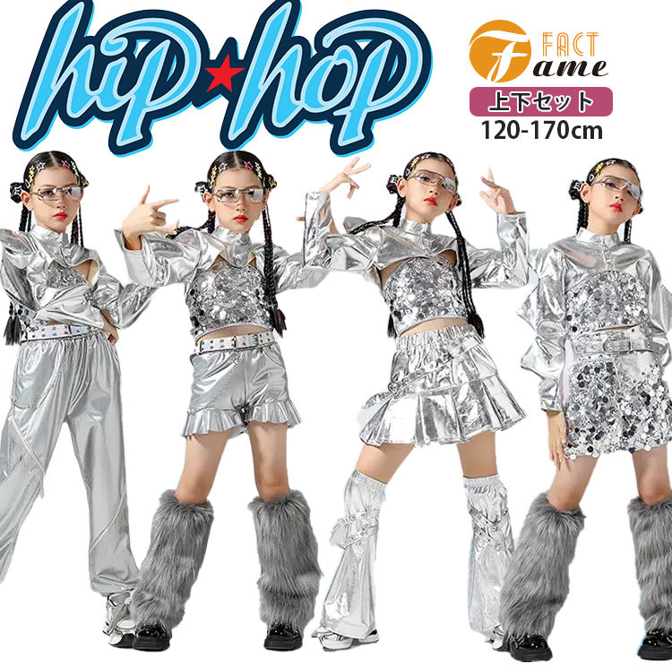 ダンス衣装 ヒップホップ キッズ チアガール シルバー トップス ズボン スパンコール 上下セット ダンスウェア 女の子 ジャズ ストリート系 オシャレ 舞台服 応援団 ステージ衣装 派手 jazz