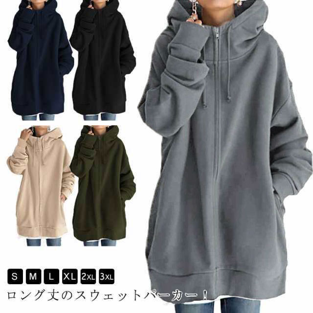 パーカー レディース トップス カットソー レディースパーカー 長袖 スウェット 無地 ファッション フルジップ ロング丈 カジュアル ゆったり 大きいサイズ 秋